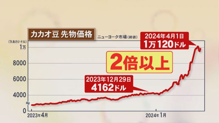 値上げの一因とされるのが、主な原料であるカカオ豆の高騰です。ニューヨーク市場での先物価格の推移をみると、2023年末には4000ドル程度でしたが、4月1日には1万ドルを上回るなど、3カ月余りで2倍以上になっています。