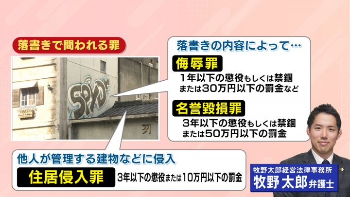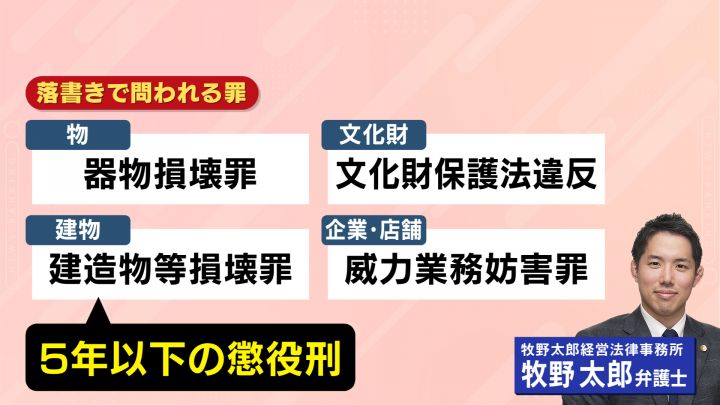 落書きは犯罪だ。牧野太郎弁護士によると、ものに落書きすれば「器物損壊罪」、そして企業や店舗などに書いてしまうと「威力業務妨害罪」となる。建物に書いた場合は「建造物等損壊罪」にあたり、5年以下の懲役刑となる。