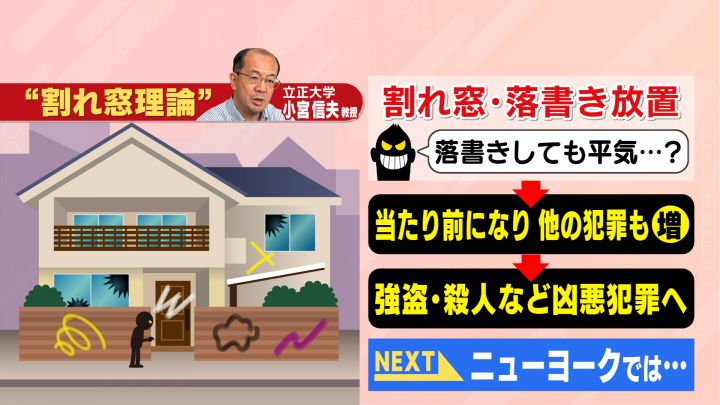 「管理が行き届いていないところで、犯罪が起きやすくなる」という考えで、例えば、割れた窓や落書きを放置していると「ここには落書きしても平気なのかな」と考え始める人が出てきて、それが次第に当たり前になっていく。そして他の犯罪も増え、最後は強盗や殺人などの凶悪犯罪の発生につながってしまうという考え方だ。