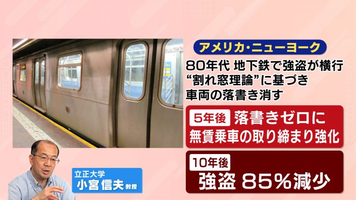 アメリカのニューヨークは、1980年代まで地下鉄で強盗が横行するなど「犯罪都市」の代名詞とも呼ばれていたが「割れ窓理論」に基づいて「車両の落書きを消す取り組み」を行ったところ、5年後、落書きがゼロになったとされている。また「無賃乗車」の取り締まりも強化すると、強盗の件数が85%も減少したという。「軽微な犯罪」を減らすことで、凶悪犯罪そのものを減らすことに成功した町として知られている。