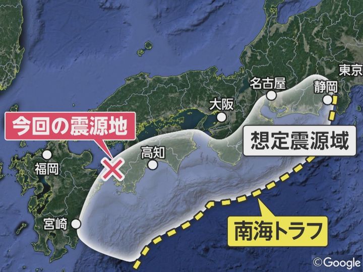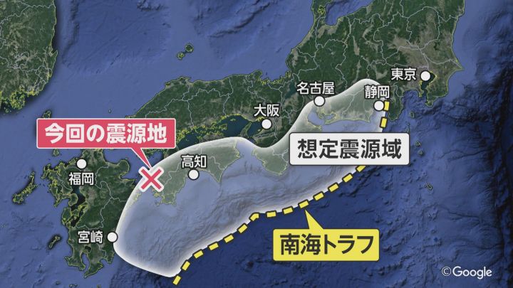 今回の地震は、南海トラフ地震の想定震源域の中が震源地です。南海トラフ巨大地震は、今後30年以内に70%から80%の確率で発生が予想されていて、マグニチュード8クラスが想定されています。