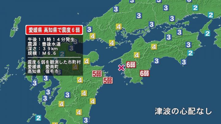 17日午後11時14分頃、愛媛県の近く豊後水道を震源としたマグニチュード6.6の地震がありました。