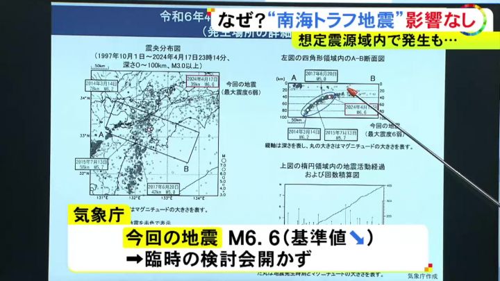 気象庁は、想定震源域でマグニチュード6.8以上の地震が起きた時に巨大地震の可能性を評価しますが、今回のマグニチュードは6.6と基準を下回ったことから、臨時の検討会は開催しませんでした。