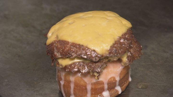 「バンズじゃなくてドーナツで挟んだハンバーガーになります。ふわふわのドーナツを毎朝揚げて、シュガーグレイズをドボッとつけて、パティは肉の食感がゴロッと出るような感じになっていて、つなぎなしの100%ビーフで粗挽きにしてある。パティ・チーズ・パティ・チーズで2枚入っている。朝か夜に野菜を食べてもらって、うちでは野菜なしで」
