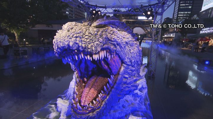19日夜、名古屋の真ん中、中部電力 MIRAI TOWER前の水面から顔をだした「ゴジラ」。むき出しの鋭い牙に、相手を威嚇するような鋭い眼光。まるで映画のスクリーンから飛び出してきたようです。