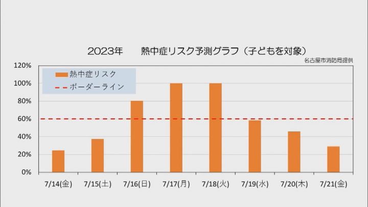 データの活用はすでに始まっています。名古屋市消防局では2023年から、熱中症の危険度を「見える化」する取り組みをしていて、最高気温や暑さ指数などを入力すると、熱中症リスクがグラフになります。この数値が60%を超えると、熱中症リスクが高い日となります。