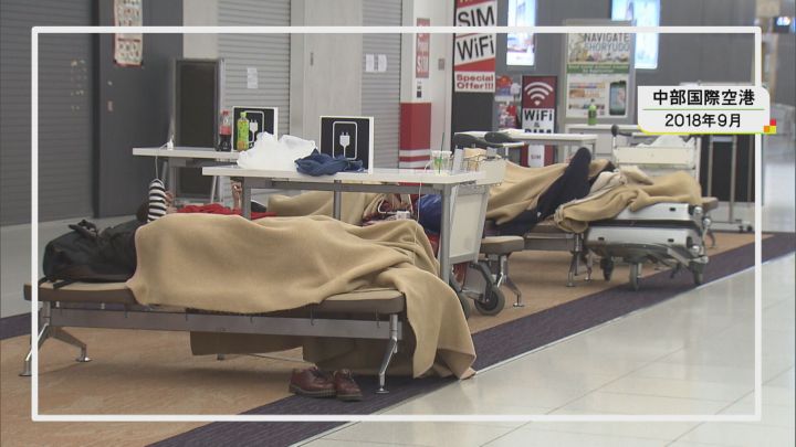 中部国際空港でも、同じ2018年の台風24号で連絡橋が封鎖され、利用客がロビーなどで一夜を過ごしました。
