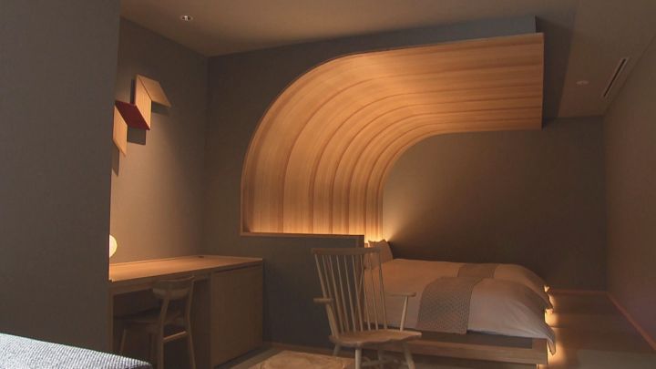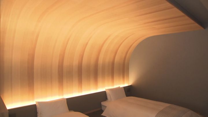 客室は、飛騨の匠の技術「曲木(まげき)」を使っていて、ベッドを包み込むように壁が一面木のデザインとなっています。