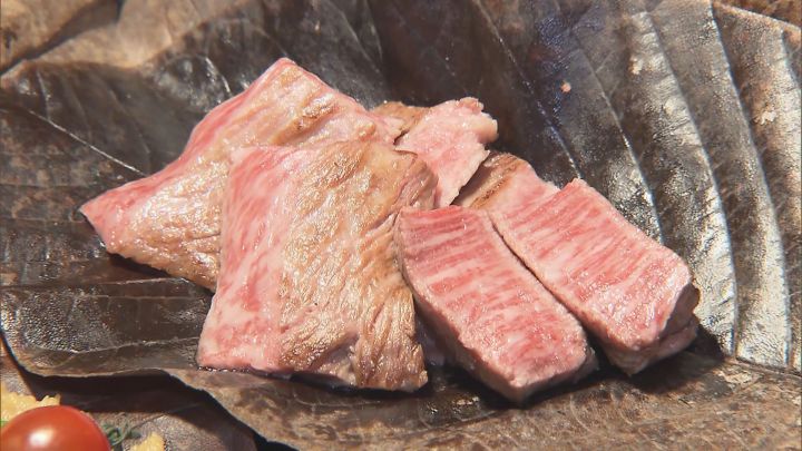 細かな霜降りが自慢の、飛騨牛を朴葉に包んで食べる「つと焼き」。