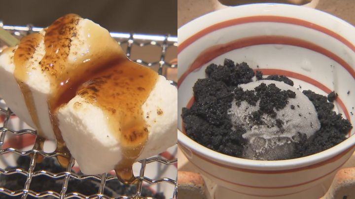 デザートには、まろやかでコクが強い飛騨の醤油を使ったみたらし餡をかけた「焼きマシュマロ」に、黒胡麻と竹すみのクランブルをかけたアイスクリーム。
