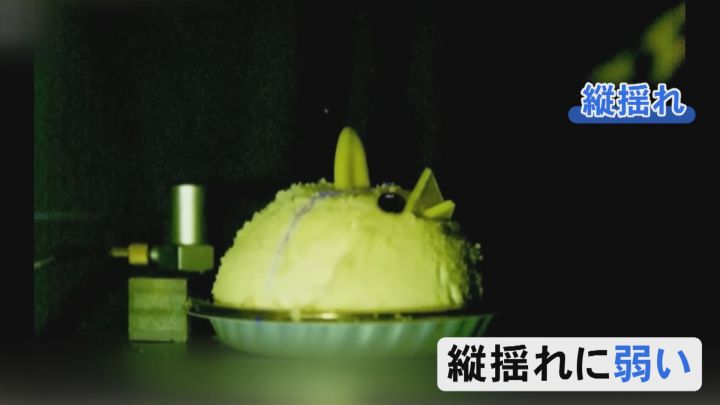 横揺れには回転しながら、意外にも踏ん張ることができています。しかし、揺れが強くなると崩れてしまいました。