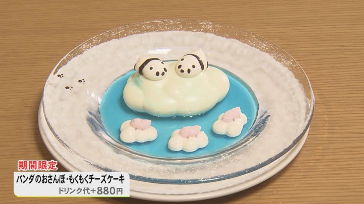 パンダメニューは他にもあります。『パンダのおさんぽ・もくもくチーズケーキ』は、ホワイトチョコを隠し味にした雲形のレアチーズケーキの上に、生クリームで作られたパンダをデコレーションしています。