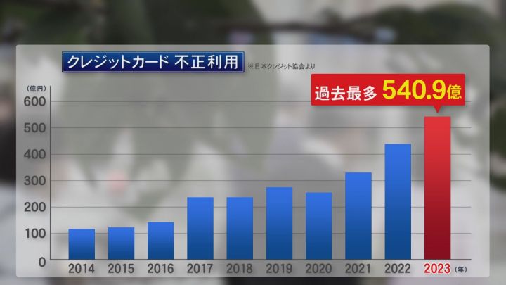 日本クレジット協会によると、クレジットカードの不正利用額は年々増加傾向にあり、2023年は、1年間で540億円を超え、過去最悪の被害となった。