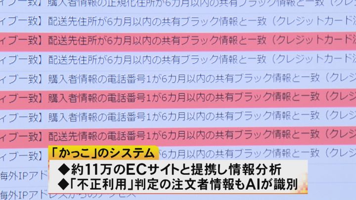 システムを販売しているおよそ11万のECサイトと提携し、注文した人の住所や電話番号などの情報を分析。怪しい部分がないかだけでなく、他のECサイトで『不正利用』と判定された注文者情報が含まれている場合も、AIが識別するという。