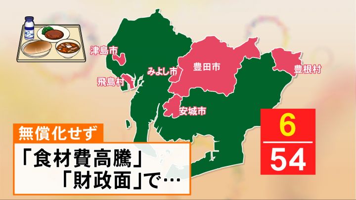 県内の公立小中学校で無償化しているのは、今回のみよし市を含め豊田市、津島市など54市町村中6市村のみです。無償化していない岡崎市や一宮市に取材すると、食材費の高騰などもあり、財政面で無償化は難しいと回答がありました。