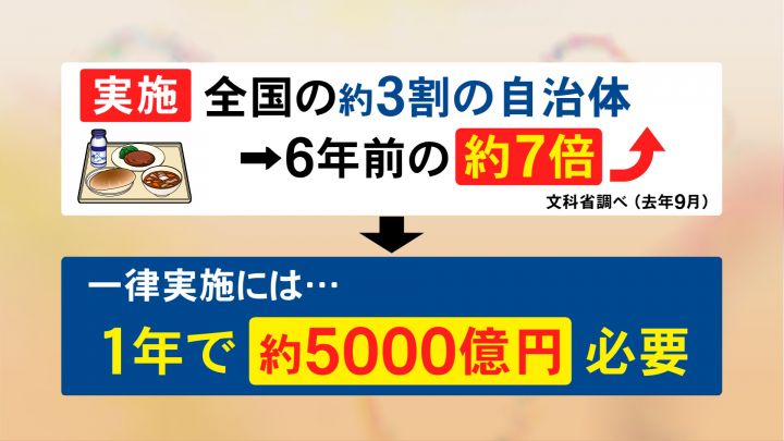 国で全国一律でという動きもありますが、試算では文科省の予算の約1割にあたる、約5千億円が1年間で必要だということです。