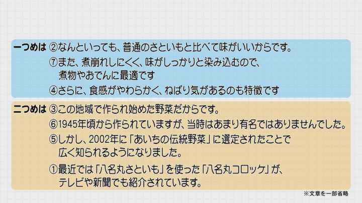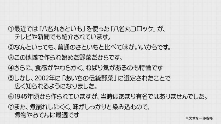 愛知県が公表している「適性検査」のサンプル問題は、新城市の特産品「八名丸さといも」を紹介するというもので、1問目では、さといもを紹介する原稿を作成する。