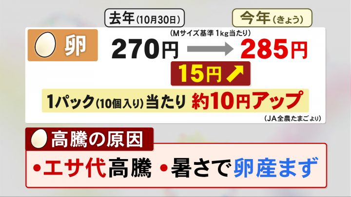 「JA全農たまご」によると、Mサイズ1キロあたりの平均卸売価格は3カ月連続で上昇し、10月30日時点で285円と、2024年の最高値を更新しています。