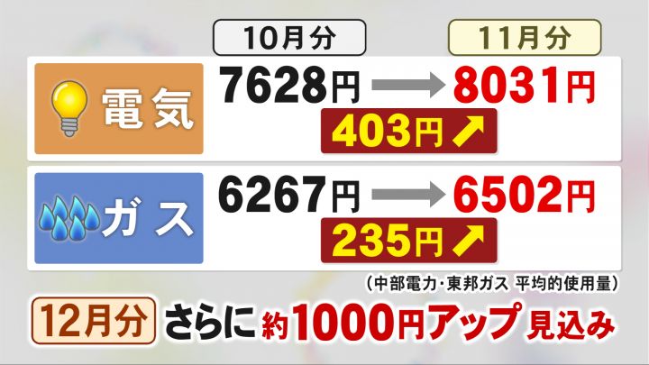家計にとってさらに厳しいのが、電気・ガス代も値上げです。11月請求分の電気料金は、平均的な使用量で8031円と、前月に比べ403円高く、ガス料金も6502円で235円高くなります。
