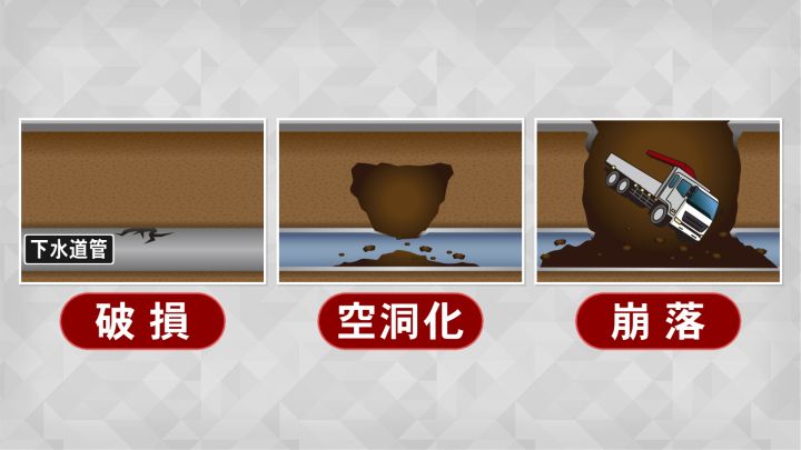 今回の事故の原因ですが、地中を走る大きな下水道管がなんらかの理由で破損し、上から地下水や土砂が流れ込んだ結果、空洞化して陥没が起きたとみられています。