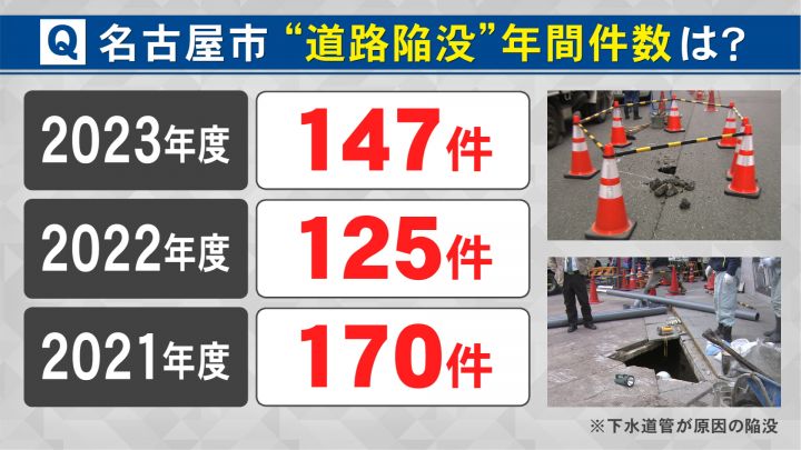 名古屋市内で起きた下水道管が原因の道路陥没の件数は、2021年度が170件、2022年度が125件、2023年度が147件となっています。道路が5センチほど陥没したという小規模のものも含めていますが、年間150件ほどとなっています。