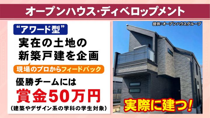 例えば「オープンハウス・ディベロップメント」は、「アワード型」のインターンです。実在する土地に新築戸建ての企画力を競う大会を開き、現場のプロから指摘やアドバイスを受けながら取り組んで、優勝チームには賞金50万円が渡されます。