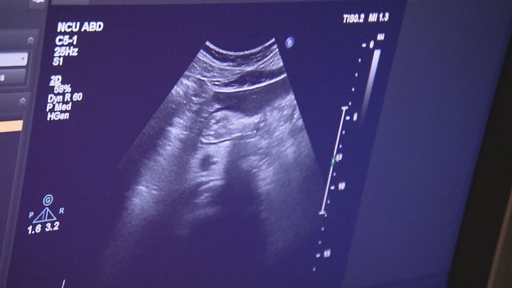 ゼリーをつけたお腹に超音波を出す機械を当てて、体の中を見ていきます。