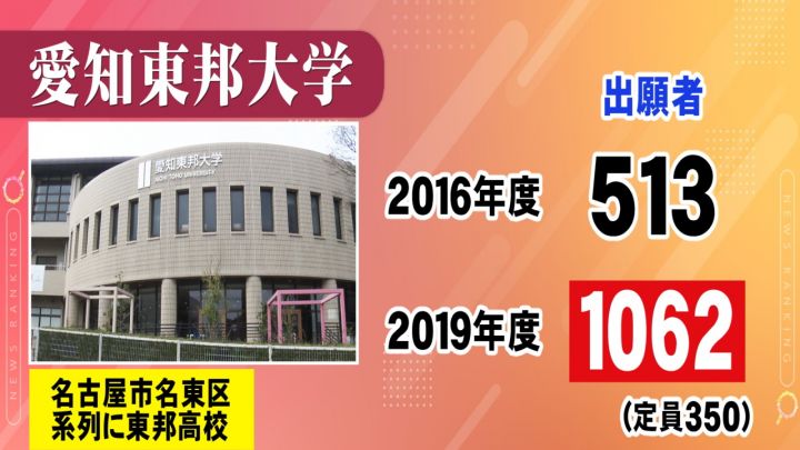 愛知東邦大学は、名古屋市名東区にある大学で、野球で有名な東邦高校も同じ系列です。実際にブランディングを始めて、2016年度は513人だった出願者が、2019年度には1062人(定員350人)と、倍以上に増えたということです。
