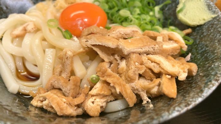 うすく伸ばした麺をあげた“揚げ麺”の下に濃厚玉子と、冷たいうどんとたっぷりのおあげが隠れています。