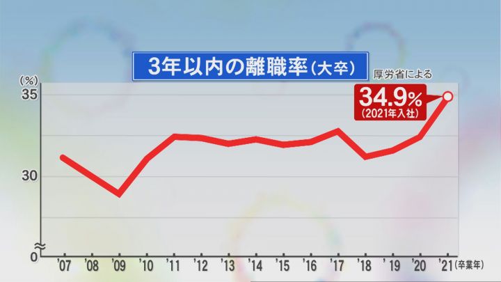 厚労省の調査では、新卒入社後3年以内に離職した人の割合は、ここ最近は3割を超えている。