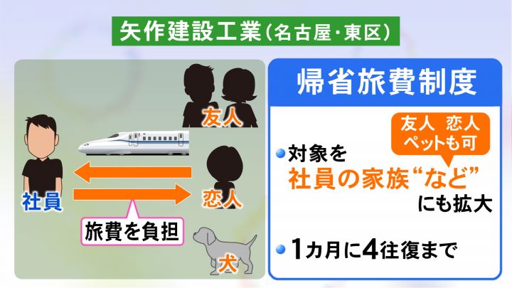 名古屋市東区の「矢作建設工業」には『帰省旅費制度』がある。単身赴任や、独身の社員が家族・友人・恋人・ペットに“会いに行く”もしくは“会いに来てもらいやすくする”ために、1カ月に4往復まで費用を出す制度だ。