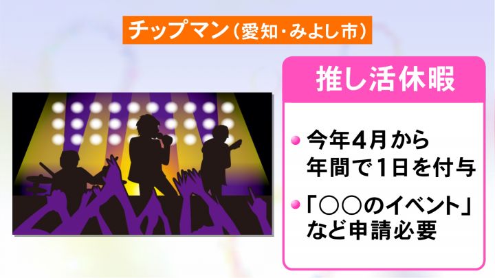 愛知県みよし市の機械メーカー「チップマン」には『推し活休暇』がある。通常の有給に加え、コンサートやイベントに行くと申請すれば、年間で1日付与される。