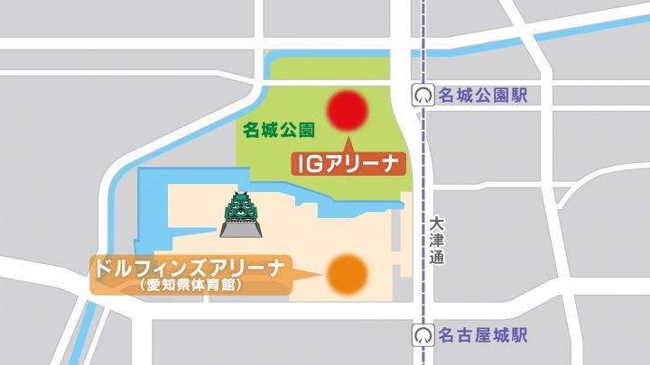 ドルフィンズアリーナは名古屋城の二の丸にありますが、IGアリーナは、名城公園の北隣で、最寄り駅は地下鉄名城線の「名城公園駅」になります。