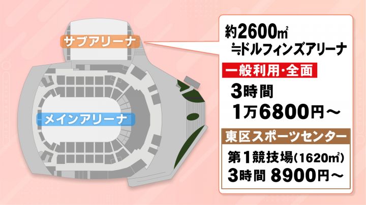 興行ではなく一般利用で、料金は3時間で16800円からです。他の一般利用と比較すると、1620平方メートルの東区のスポーツセンターの第1競技場は、同じ3時間で8900円からです。