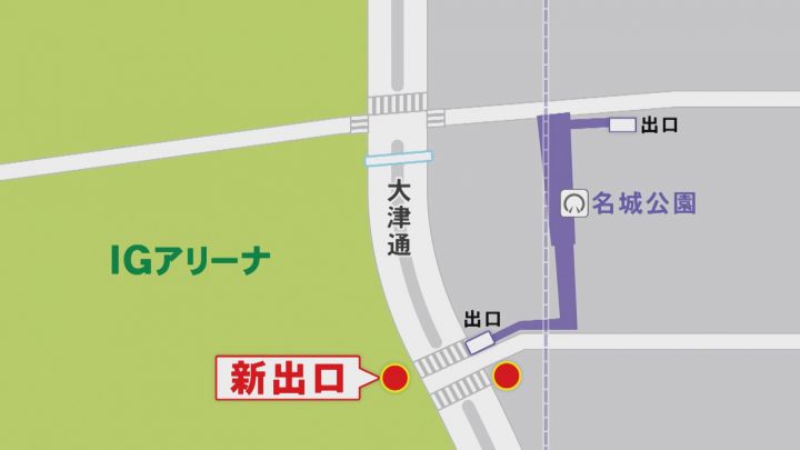 現在の出口はすべて大通りの東側で、IGアリーナや名城公園に行くには横断歩道や歩道橋を渡らなければなりませんが、新しい出口が2つ設けられ、このうちの1つは、地下道で通りを横断することができるため、IGアリーナの目の前に出ることができ、HPに書かれている「徒歩およそ0分」が実現されます。