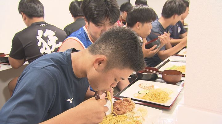 練習を終えた後の夕食、部員たちは山盛りのごはんやボリューム満点のおかずを、モリモリと食べている。