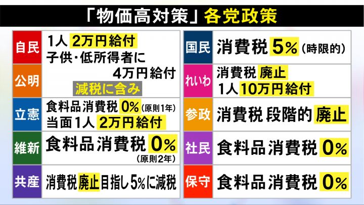 今回の参院選では、物価高対策が最大の争点となっている。与党が現金給付を公約にしているのに対し、野党各党は、消費税の「減税」や「廃止」を打ち出している。