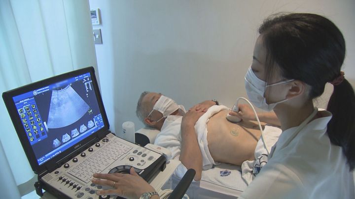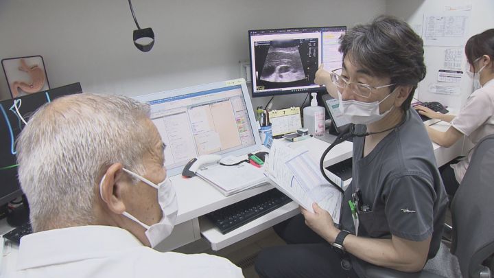名古屋市北区のクリニックでは、60代の男性が「腹部エコー検査」を受けていた。お腹にゼリーをつけ、超音波を出す機械を当てると、体の中をリアルタイムで見ることができる。