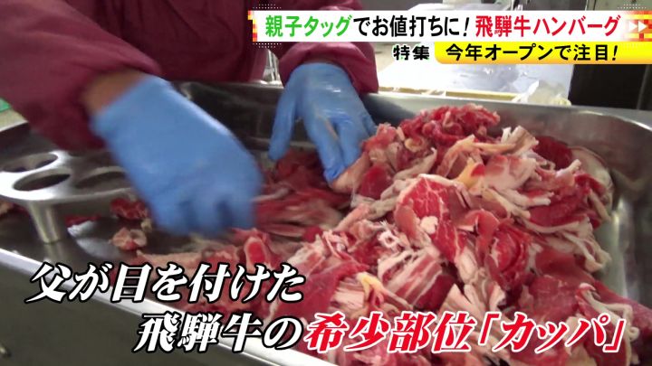 「飛騨牛のカッパ。脂が多いですけど、溶ける脂。甘みも出るし粘り気も出る。ハンバーグには適している」