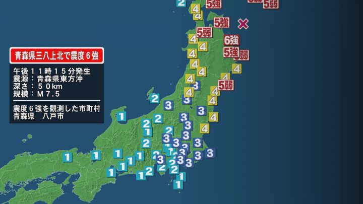 8日午後11時15分ごろ、青森県東方沖を震源として発生した強い地震。八戸市で震度6強、名古屋市内でも震度1を観測するなど揺れは広い範囲に及び、岩手県の久慈港では70センチの津波も観測されました。