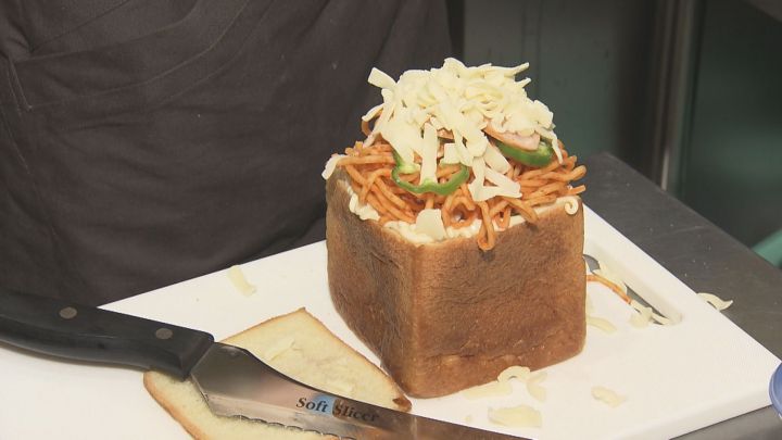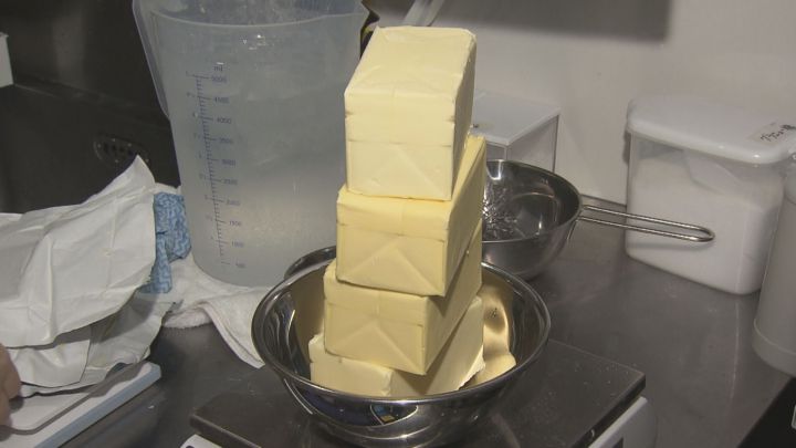 厨房で見つけたのは、巨大なバター。通常の食パンの10倍のバターを使っています。ポイントは、数種類をブレンドした国産小麦で作った生地に限界まで練り込むこと。金型に詰めて発酵させ、オーブンで約30分焼けば完成です。