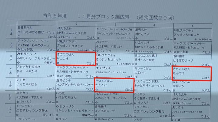 例えば「きのこご飯とだんご汁」は、この週は3つのブロックで出されますが、同じ日に出されることはありません。こうした組み換えには様々な制約があり、担当者の悩みの種となっています。