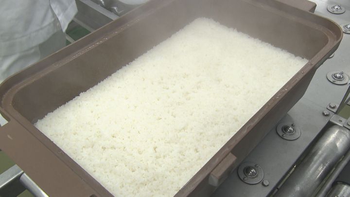 「午前3時くらいから作業してます。こちらがご飯を作っているラインになります、いまは給水をした後、これから窯に入る形の工程になります」