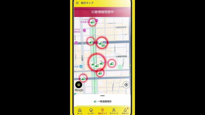 名古屋市防災アプリでは、差し迫った危険から逃れるため、災害発生直後にまず向かう「指定緊急避難場所」や、行き場のない帰宅困難者などが一時的に滞在できる「一時退避場所」などを確認することができます。
