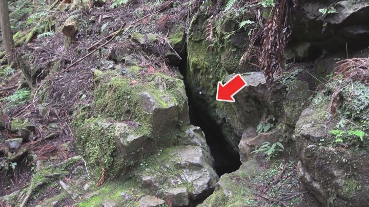 その入り口は、森にある岩場の穴。人ひとりがやっと通れる大きさです。