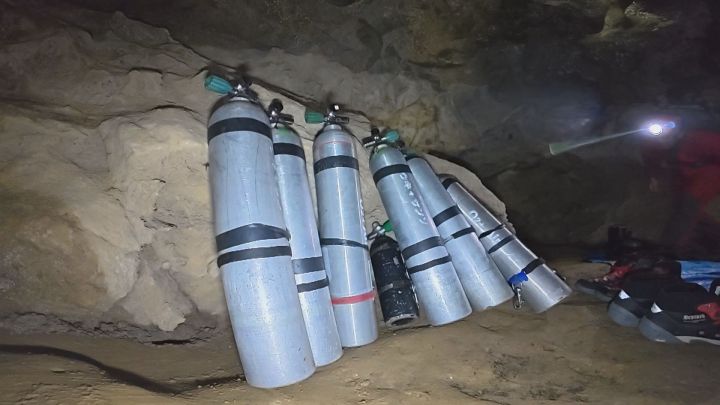 地底湖の探検には、予備の酸素ボンベなど大量の機材が必要なため、運搬だけで一苦労です。