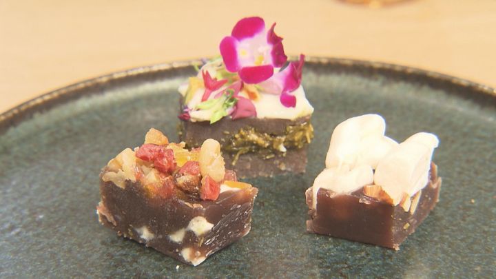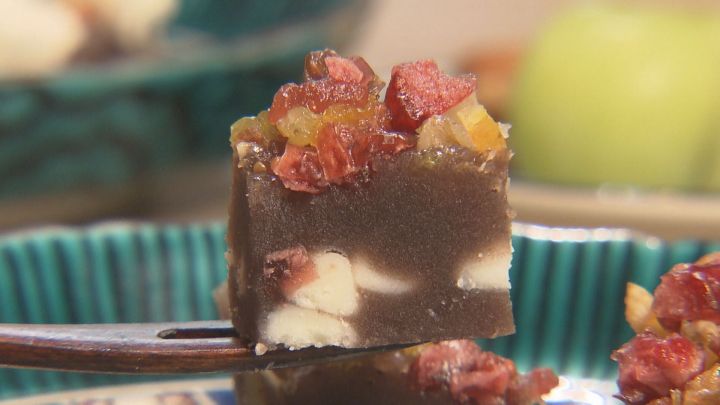 そこへホワイトチョコレート、さらに食感のアクセントになるクルミと、季節ごとにかわるドライフルーツを合わせることで、果実の酸味とチョコの甘みが絶妙に溶け合う和洋折衷のようかんの完成です。