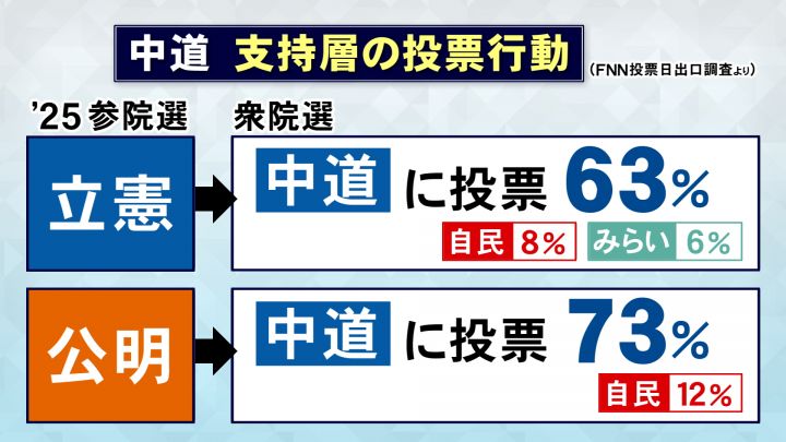 FNNの出口調査によると、2025年の参院選の比例区で立憲民主党に投票した人のうち、今回、中道改革連合に入れた人は6割余りにとどまりました。一部が自民党や今回躍進したチームみらいに流れています。