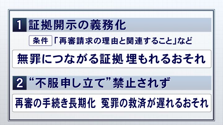 ただし、「再審請求の理由と関連すること」など条件が付いていて、証拠開示の範囲がこれまでよりも狭まり、無罪につながる証拠が埋もれる恐れが指摘されている。