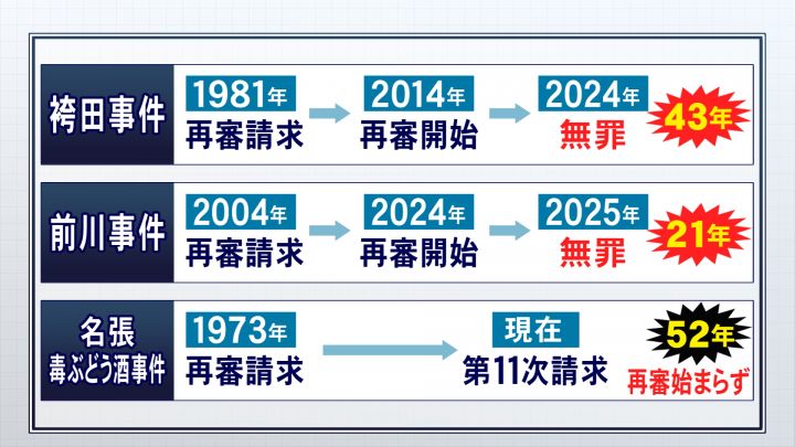 再審の請求開始から無罪となるまでの期間は、袴田事件では43年。福井市の女子中学生殺害事件で、2025年8月に再審無罪となった前川事件では、21年を要した。
